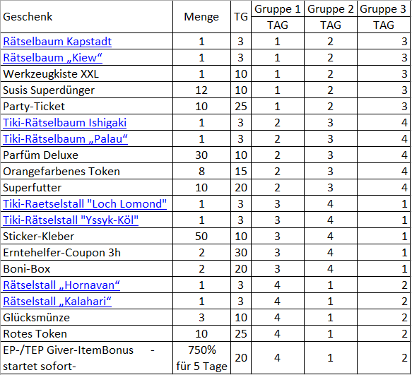 In der FAQ heißt es aber auch wörtlich "- die Geschenke sind in 3 Gruppen unterteilt, die jeden Tag wechseln". Ich hatte das so verstanden, dass es für alle den ersten Baum der Geschenketabelle, Kapstadt, an Tag 1, 2 und 3 gibt. Den zweiten Baum, Ishigaki, an Tag 2, 3 und 4. Dass also die Geschenke in Gruppen sind, nicht die User. :oops: So kann man sich irren. xD Aber egal, einem geschenkten Baum schaut man nicht ins Maul oder so. ;)