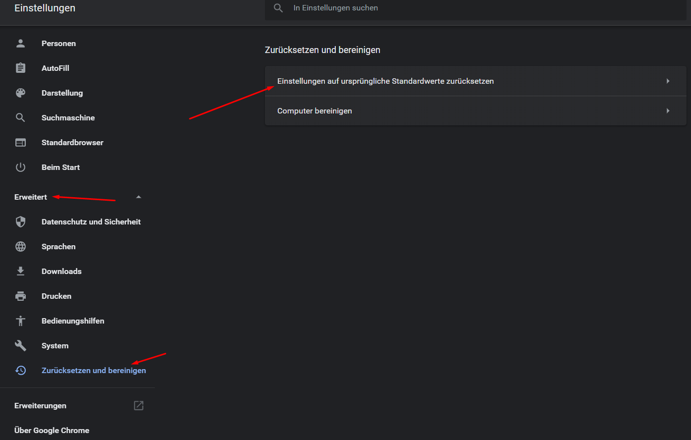 dann öffnet sich ein neues Fenster, dort gehst du auf erweitert, zurücksetzen und bereinigen und auf Einstellungen auf ursprüngliche Standardwerte zurücksetzen